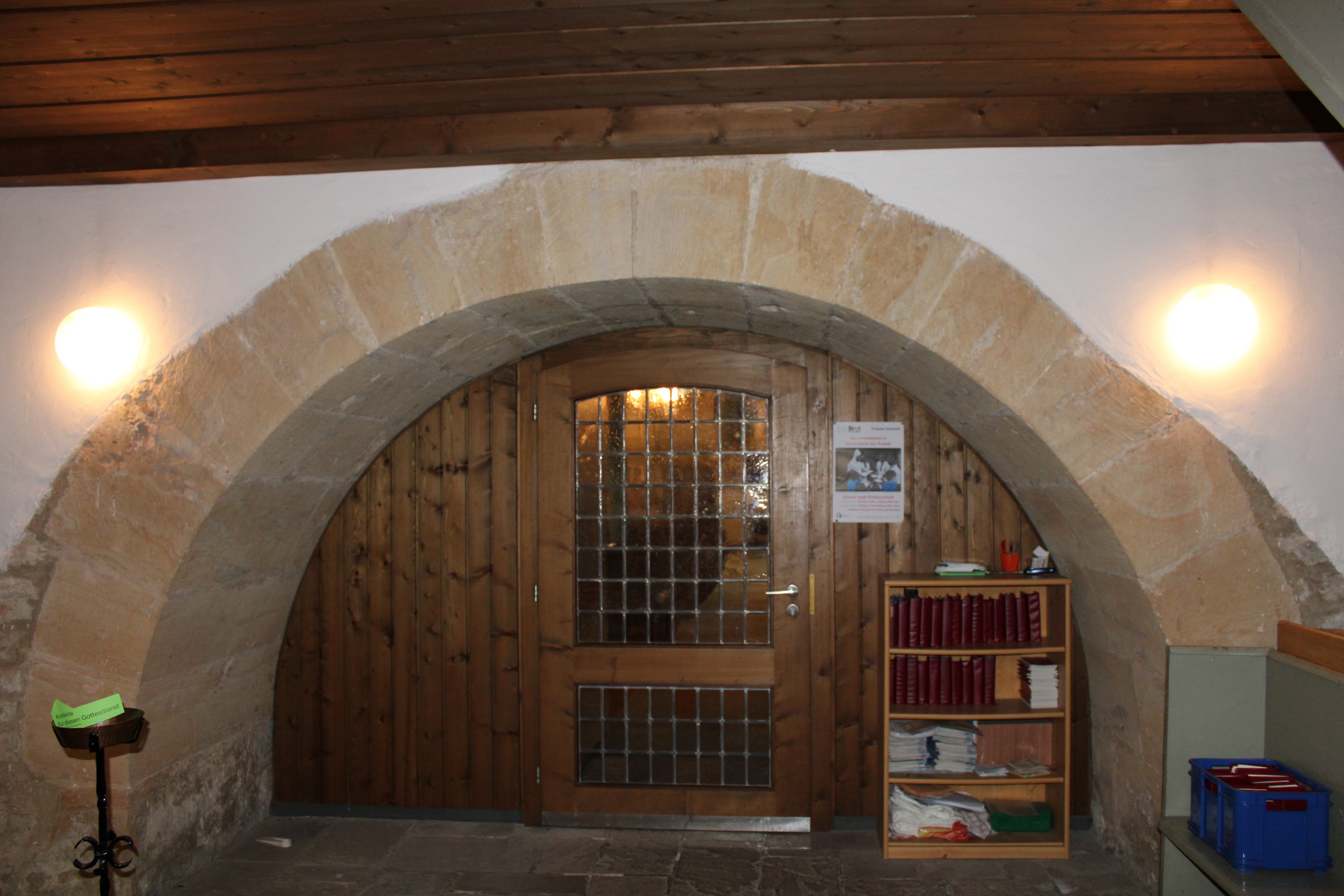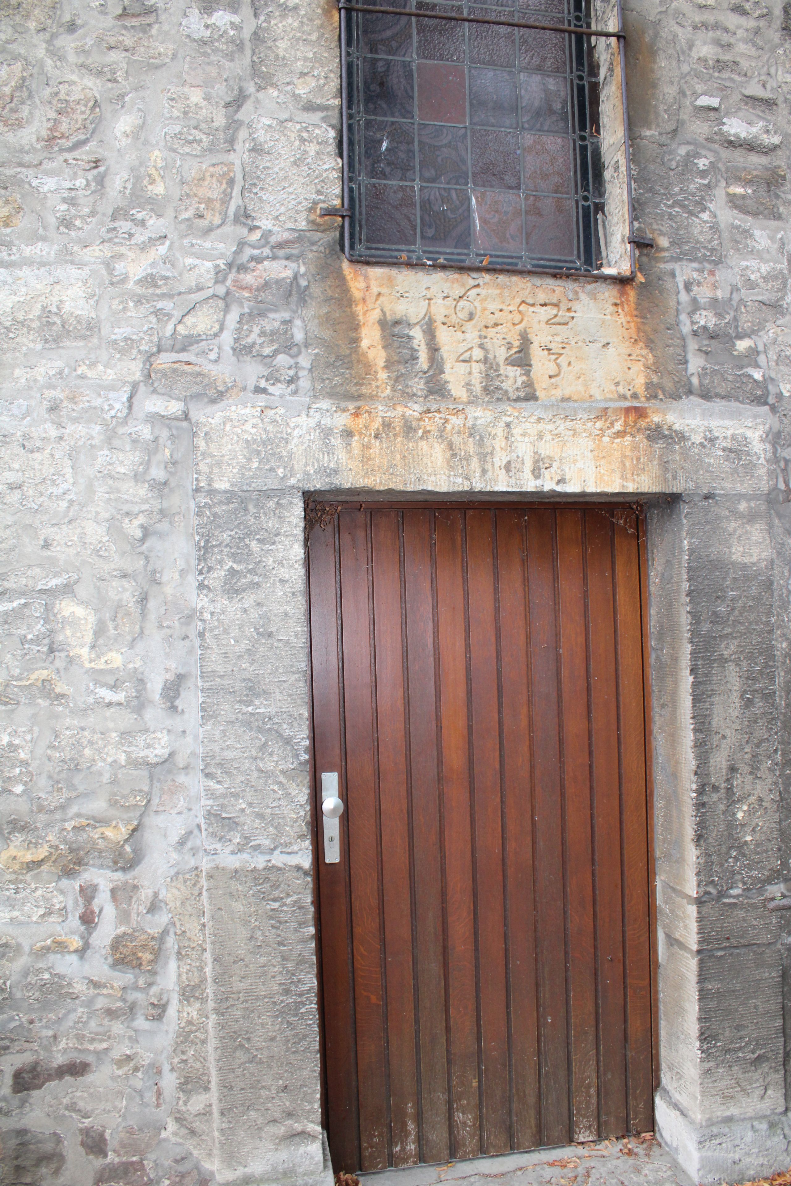 An der Südwand der Kirche sieht man noch deutlich eine zugemauerte Tür, deren Höhe von nur 1,5 m zeigt, wie klein die Menschen im Mittelalter waren. Die heutige Eingangstür für die Gemeinde wurde offenbar erst 1652 geschaffen, damals die gotische Tür zugemauert.